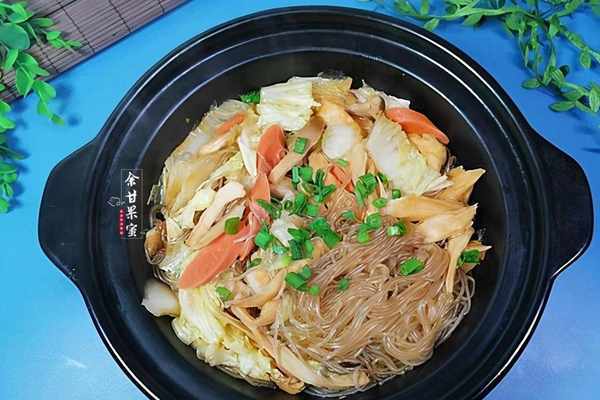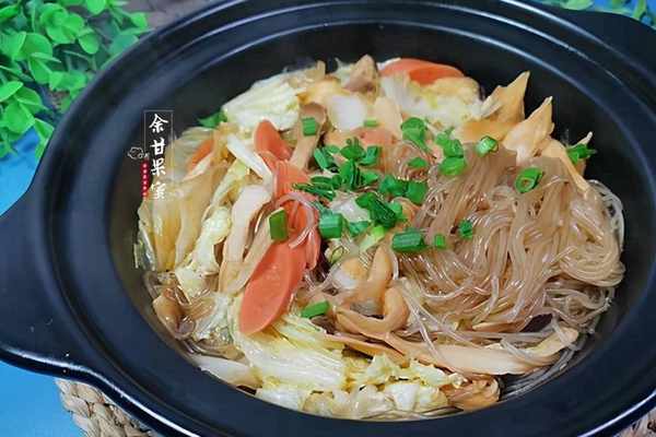 大白菜杏鲍菇炖粉条:大白菜200克、粉条150克、杏鲍菇200克、香葱2根、精盐3克、白胡椒粉少许、食用油2汤匙。