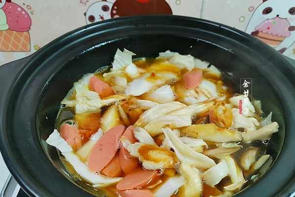 第5步:加入白菜梗、火腿肠,先炖约四五分钟;白菜要炖得软烂,吃着更鲜;