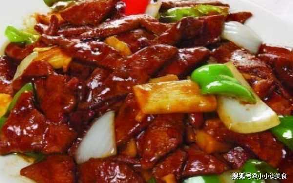 3.在平底锅中加热油,将葱和姜炒至焦黄。倒入猪肝翻炒。猪油变色变硬。取出备用;锅中下油烧热,倒入黄瓜、青红椒炒匀;然后把五花肉倒入炒熟;加入准备好的酱汁炒至顺滑,最后加入香油关火