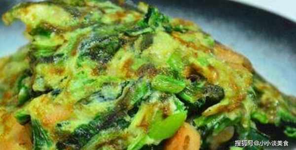 3、锅烧热,放油,摇动锅让锅底沾满油,倒入菠菜奶油,中小火炒,用筷子转动铲子帮忙,再煎一会儿,让面团完全熟了。金的。淋上干净的蛋液,待蛋液凝固后,翻面煎至两面金黄。