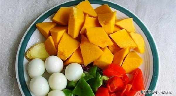 【做法】:①:将鹌鹑蛋煮熟去壳,南瓜洗净,去皮切块。