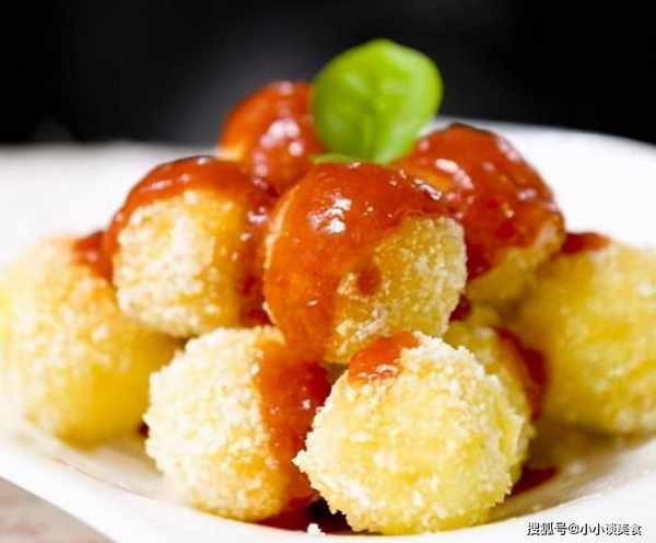 7.锅中留少许油,加入番茄酱,待番茄酱起泡后,淋在炸好的土豆球上即可。