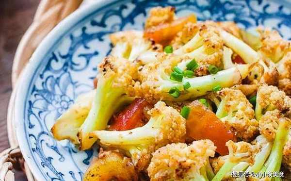 3.待花菜变色(菜茎变绿)后,加入番茄块,待花菜变红时,加入盐和新鲜蔬菜调味料,炒匀即可食用。