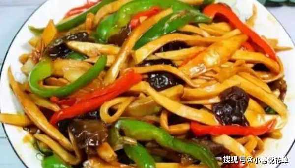 豆腐条先用温水泡软,五花肉切丝,青椒撕成小块,蒜拍碎,辣椒剁碎;肉片在锅里放少许油煎至两面变色,加入大蒜炒香;加入腐竹翻炒均匀,加入料酒、老抽、胡椒粉、糖和刚泡过材料的水烧开;转小火慢炖,汁很快收干,然后加入切好的青椒丁和辣椒炒至顺滑,搅拌均匀,点加入鸡精淋上香油。