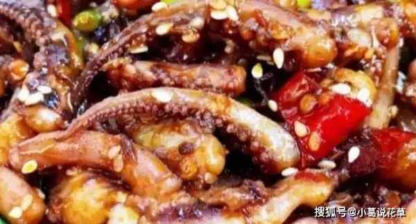 4.加入鱿鱼翻炒几分钟,然后加入孜然和白芝麻翻炒均匀。