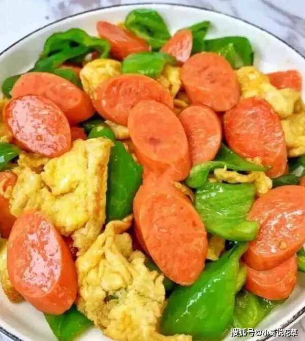 2.将鸡蛋混合,煎至熟捞出。另取一个油锅,将香肠和青椒炒熟,加入鸡蛋。