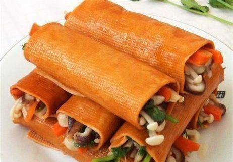 11将炸好的豆腐皮金针菇卷放入盘中。