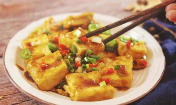3、擦去豆腐表面的水分,锅中油烧热,放入豆腐,煎至一面金黄翻面,两面金黄;