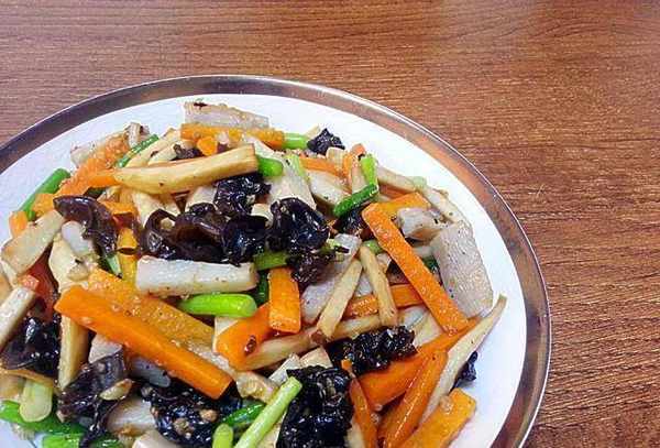 配料:杏鲍菇一个;莲藕;胡萝卜;黑霉;蒜苔。主要成分按降序排列;姜末适量;更多切碎的大蒜(根据个人口味);酱油适量;胡椒粉适量;适量的盐;植物油适量