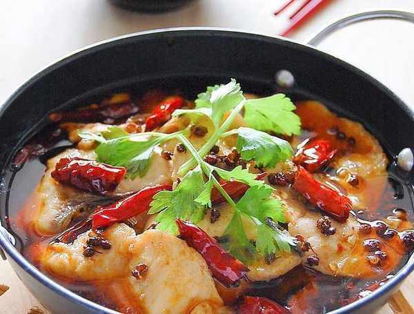 鱼片和汤连同小菜一起放入锅中。然后将之前做好的五香油倒入另一个小锅中,加入适量的花椒粒和干辣椒段,用小火炒香。当辣椒的颜色略有变化时,关火,把热油倒在鱼身上。将锅一起盛在一块上。