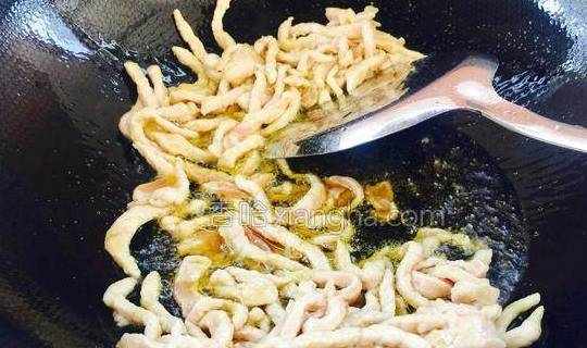 6.锅烧热倒入油,油温八成热时倒入肉丝滑炒断生后盛出。