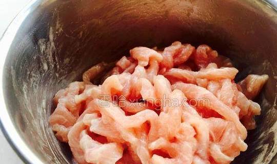 4.给切好的肉丝里加入少许盐,料酒,玉米淀粉搅拌均匀腌制片刻。