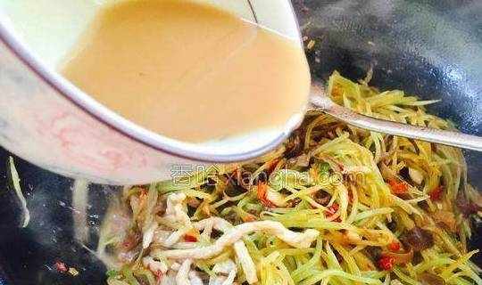 10.把做好的料碗搅拌一下,把沉淀的淀粉搅拌起来,倒入锅中翻炒一分钟就可以关火了。
