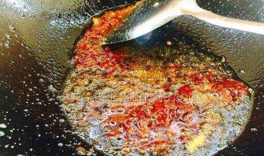 7.用滑炒肉丝的油把郫县豆瓣炒出红油。