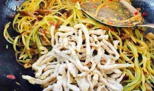 9.倒入莴笋丝和木耳丝翻炒断生,放入肉丝翻炒均匀。