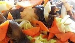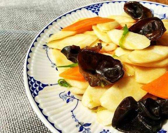 3、热锅热油,爆香葱花,将胡萝卜放入稍微翻炒一下。加蚝油和少许水,炒开,倒入山药和木耳。加少许盐,翻炒片刻出锅即可。