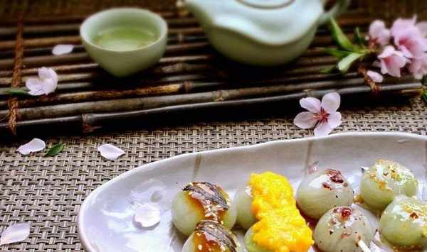 -材料-水晶汤圆1包,生抽1汤匙、白糖2茶匙,淀粉1茶匙、海苔半张,蓝莓果酱1茶匙、小芒果1个,糖桂花1汤匙、干桂花、熟白芝麻适量