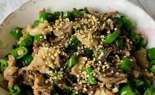 食材:剔骨肉200克、火麻仁15克、线椒6~7根、姜适量、蒜末适量、料酒适量、糖适量、盐适量、蚝油适量。