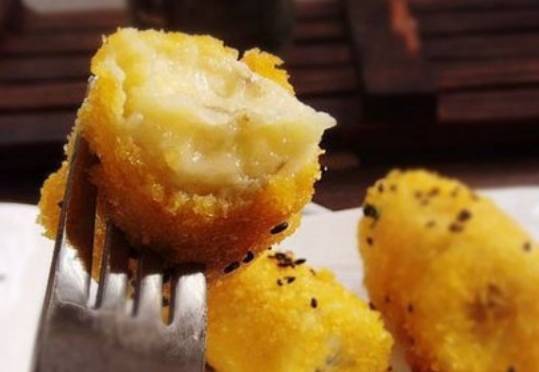 食材:香蕉2根、鸡蛋2个、蛋卷2包、面包糠、盐少许、白糖