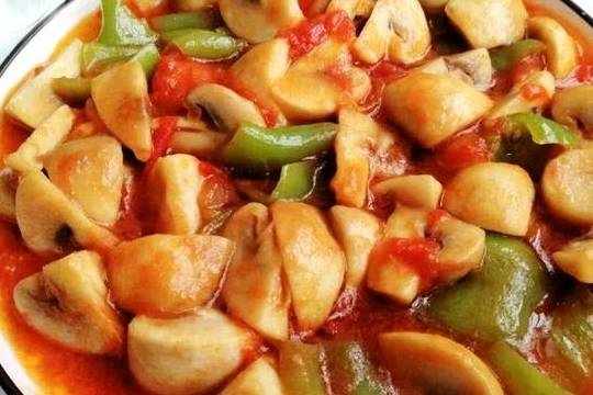 食材:草菇150克、辣椒2个、西红柿1个、油适量、盐、蚝油、生抽