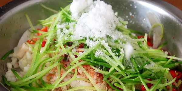 5、将咱们腌好的白菜放到水中清洗干净,再用手撕成小丝,丝尽量细一点,撕好之后将其放到一个盘中,然后再把蒜末,田梨丁,辣椒面,青红椒碎,萝卜丝,白醋,白糖,花椒粉全部放进去。