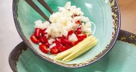 2、姜切丝、小米椒切碎、小葱切末