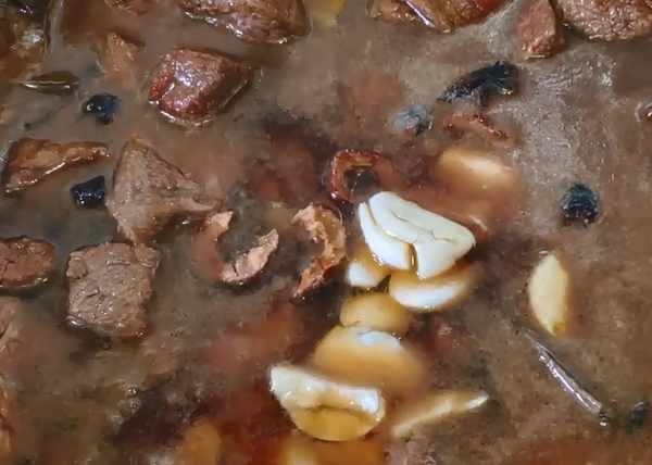 加入山楂,大蒜,喜欢辣的加入干辣椒段,加一勺食盐,用勺子搅拌一下,然后盖上盖子,大火烧开,水开后转小火,慢炖90分钟