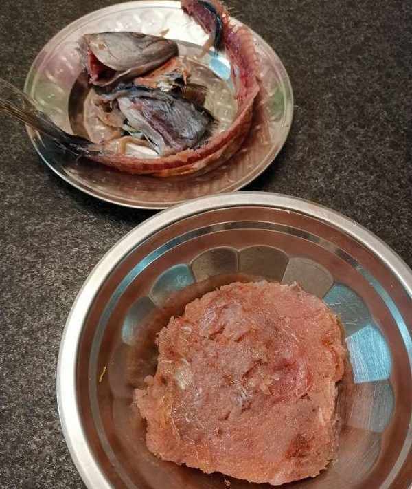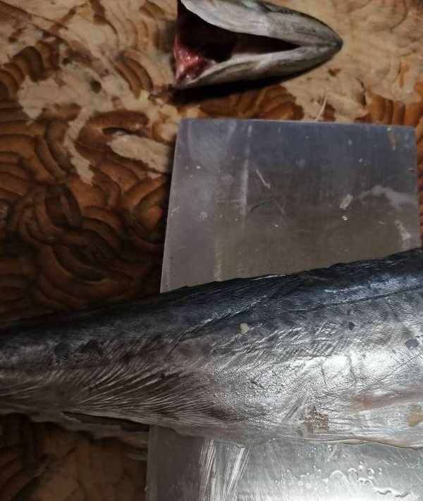 2、将处理好鲅鱼,将鱼头切下;鱼身用刀沿鱼骨片开。