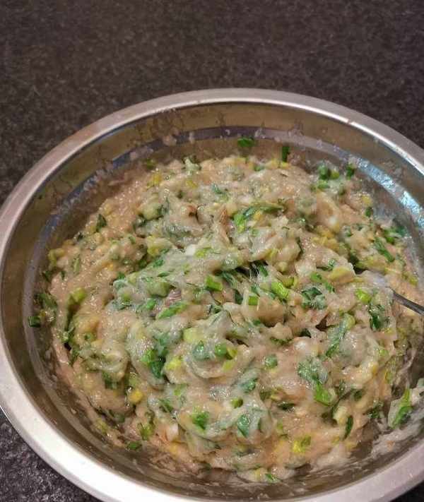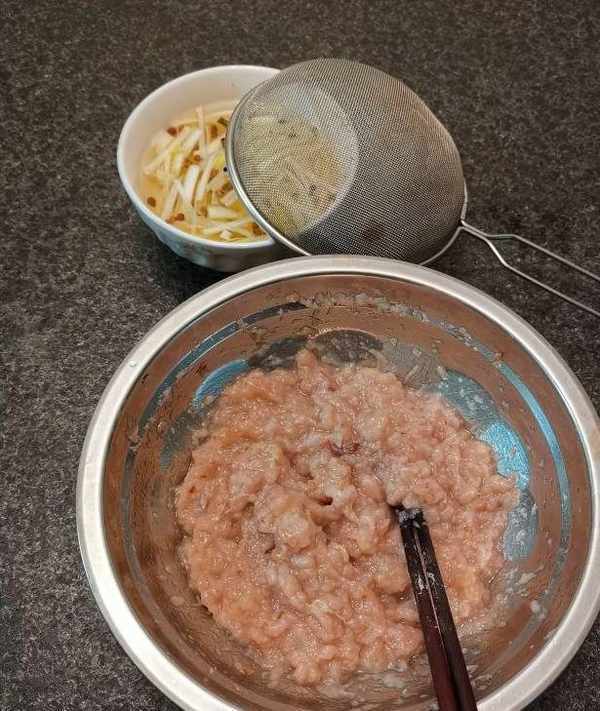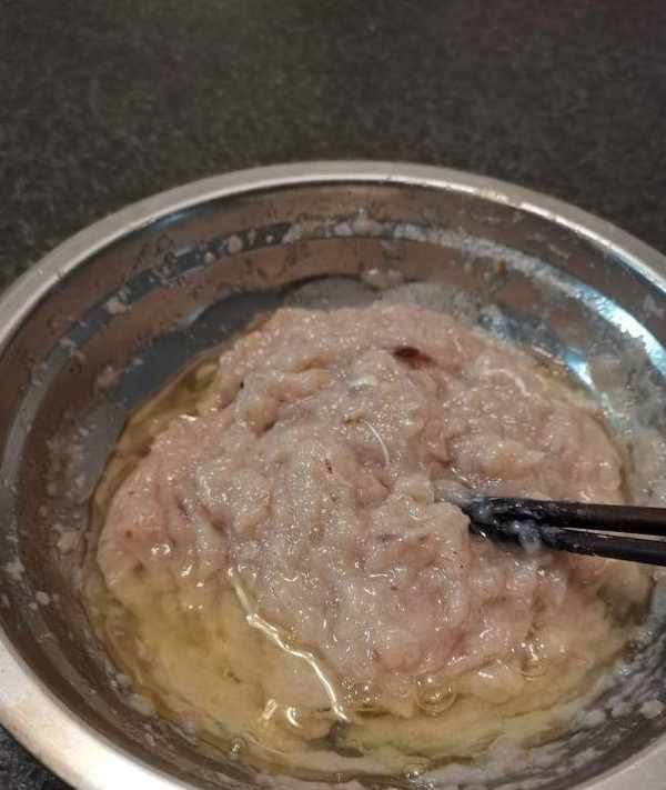 最后放入猪油(或五花肉馅)。因为鲅鱼的油性小,放入猪油(或五花肉)后,调出的馅料口感更润,不发柴。