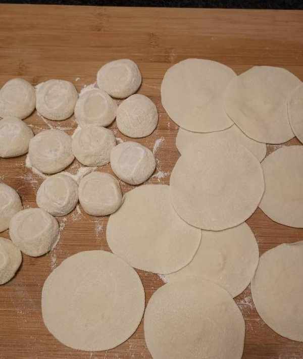 5、将醒好的面团取出放案板揉匀、下剂、擀皮、包馅。