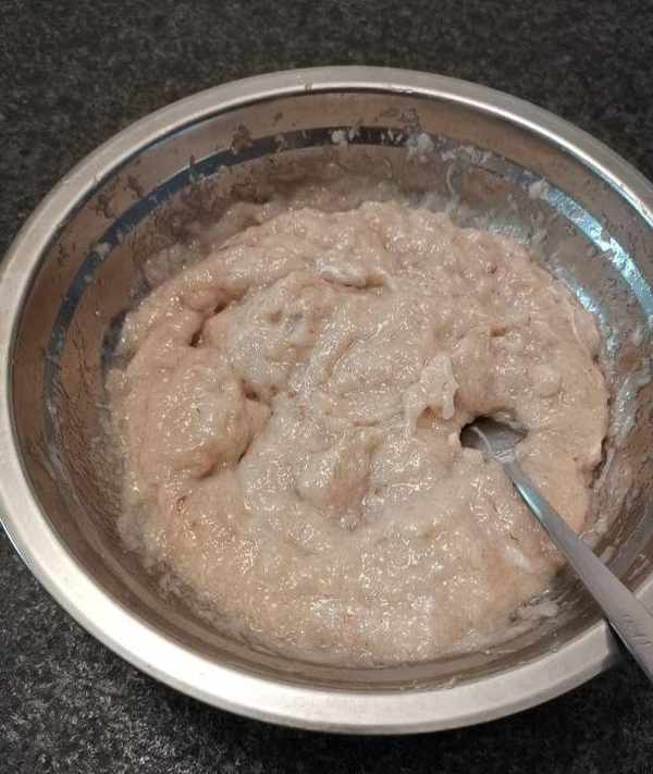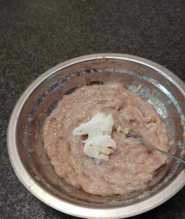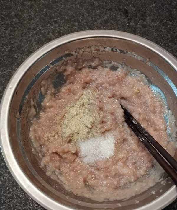 4、将晾凉的葱、姜、花椒水分次少量的加入鱼肉馅中,搅打成合适的稀稠程度。要分次加分次搅打。