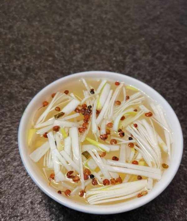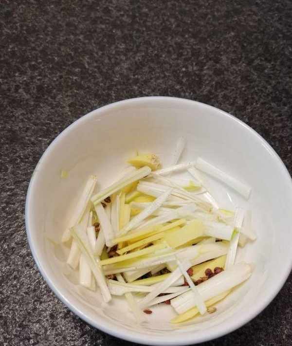再提前准备下适量葱、姜、花椒水(将葱丝、姜丝及花椒粒放入碗中,倒入热水浸泡出香味)