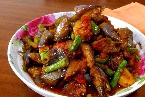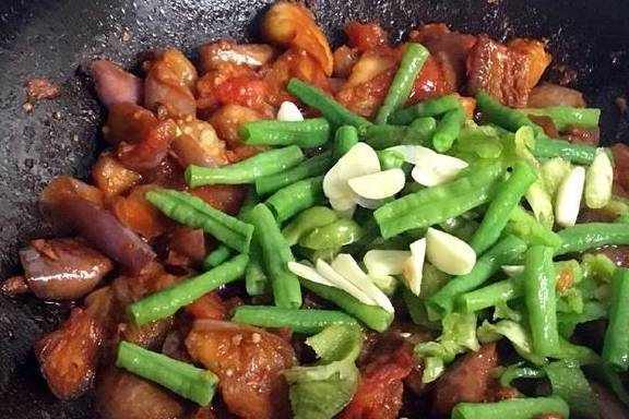 5.茄子用铲子压压,软软的感觉,西红柿炒出汁,倒入豇豆、青椒,大蒜翻炒均匀即可出锅。