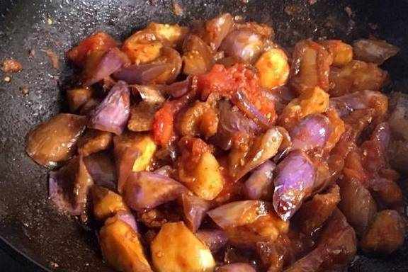 4.锅里放入少许油,倒入腌好的茄子,西红柿翻炒