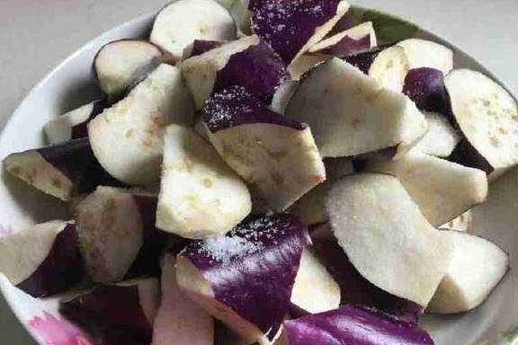 2.茄子滚刀切,洒上一份菜用的盐,淹30分钟备用