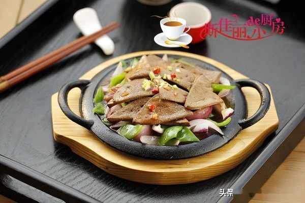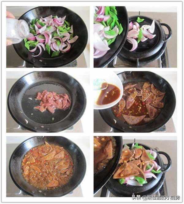 7. 加入少许盐调味翻炒均匀; 8. 将铁板放在炉火上加热, 再将炒好的洋葱青椒平铺在铁板上; 9. 烧热锅放入适量的油,将猪肝放进锅中翻炒至变色; 10. 倒入准备好的碗汁进锅翻炒两分钟; 11. 大火收汁,注意要把握火候, 猪肝不要炒太长时间, 避免猪肝煮老了;12. 最后将猪肝浇淋在铁板上的配菜上即可。