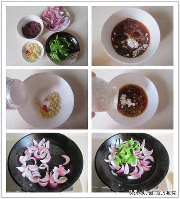 原料: 猪肝 青椒 洋葱 蒜末 生抽 红椒 料酒 淀粉 油盐