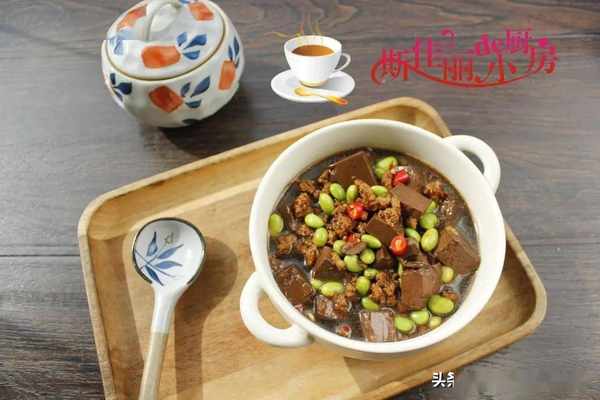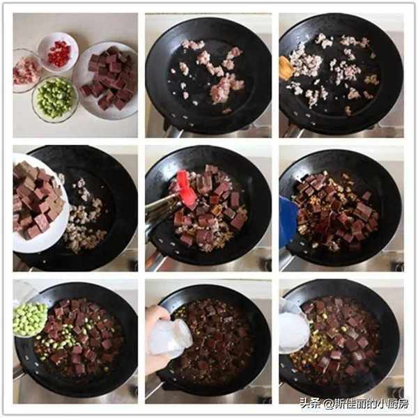 制作:1. 准备好食材; 2 热锅凉油,将少许肉末放进锅中煸炒至变色; 3. 加入1勺料酒翻炒均匀; 4. 加入准备好的鸭血块进锅翻炒; 5. 加入1勺生抽翻炒均匀; 6. 加入适量的水炖煮; 7. 加入1把毛豆米进锅去煮上3分钟; 8. 加入适量的盐翻炒均匀; 9. 最后加入少许水淀粉后大火收汁即可。