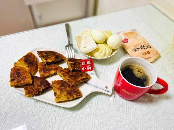 早餐二:猪肉馅饼,包子,桂花糕,鸡蛋。黑咖啡是我喝的,孩子喝的是酸奶。这一餐半成品为主,冰箱里囤点半成品还是很有必要的。这样早餐来不及或者不知道吃什么的时候,拿出来蒸一下,煎一下就搞定了。