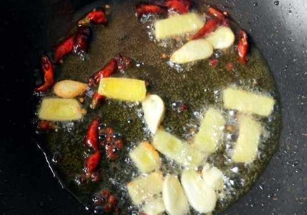 步驟五:鍋內放油,放生薑,大蒜,幹辣椒,花椒爆香。