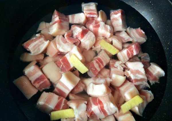 步驟四:鍋內放清水,五花肉冷水下鍋,放幾片生薑,一勺料酒,將五花肉焯水後撈出沖洗幹凈。