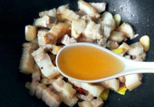 步驟六:放入五花肉翻炒,放一勺料酒,一勺生抽,適量的老抽翻炒。