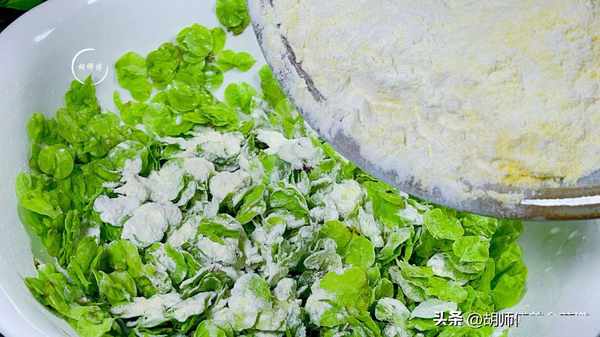 第二步:把玉米粉、面粉、食鹽全部混合在一起拌勻,然後將一勺食用油放入到瀝幹水分的榆錢中拌勻,放食用油可以防止榆錢蒸的過黃,接著將拌好的面粉分2-3次放入到榆錢中拌勻即可。面粉不要一次全都放入到榆錢中,這樣會有大量的面疙瘩形成。