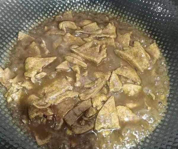 第四步,把剛才煸炒好的豬肝,放入鍋裡翻炒均勻,加入少許水,蓋鍋蓋燜至入味。