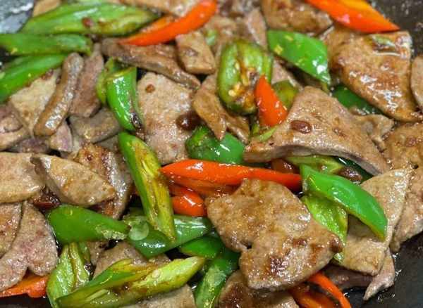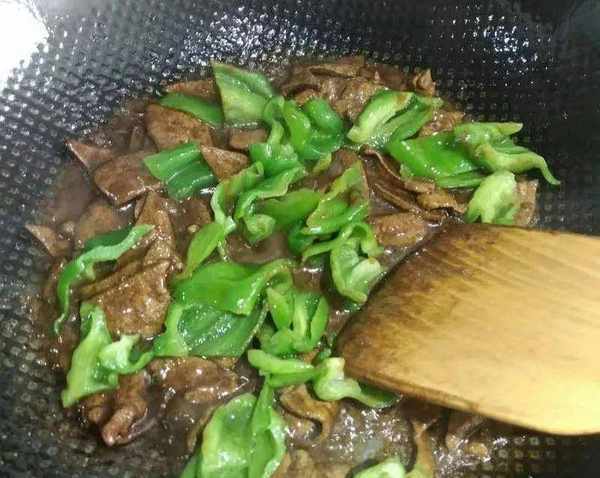 食材:豬肝,青椒,料酒,鹽,生抽,老抽,淀粉