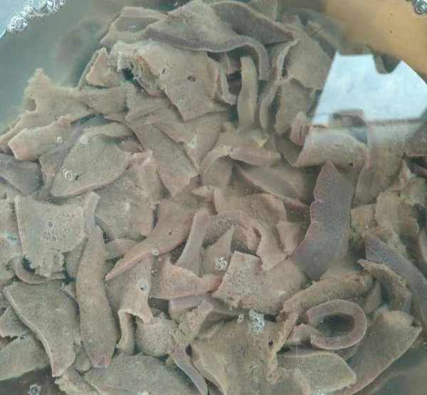 第一步,豬肝切成片,要切薄一些不要太厚,放在清水裡泡一會。