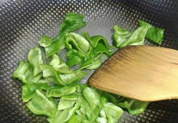第三步,鍋裡加入少許底油,把青椒倒入鍋裡炒到七分熟。