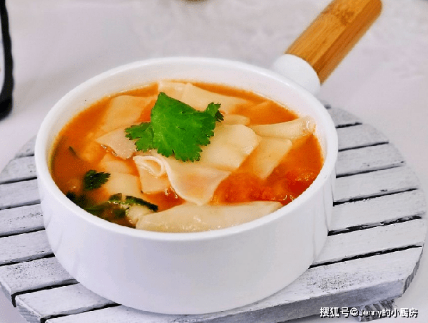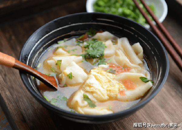 面片熟後,加鹽調味,這道早餐就做好瞭,出鍋後放些香菜,就可以食用瞭。