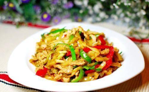 材料:榨菜200克、瘦肉108克、大蒜2瓣、薑絲3片、青紅椒2個、蔥絲半根、料酒1湯匙、生抽1湯匙、植物油適量