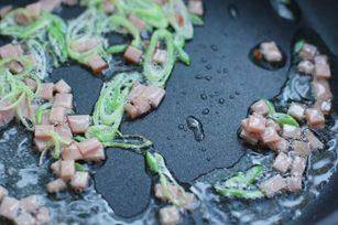 第四步,在炒鍋裡面倒入適量的油,燒熱至五成熱的時候,放進蔥花爆香,接著放入火腿丁,炒至變成焦黃色
